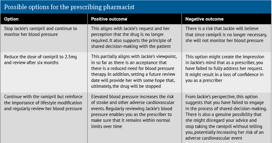 The prescribing pharmacist in deciding to deprescribe ramipril should also seek to reach an agreement with Jackie that she attends scheduled appointments, either at her GP surgery or her local pharmacy, over the next few months for regular BP monitoring.