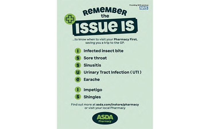The ISSUE IS campaign uses a simple acronym to promote the seven conditions for which Pharmacy First can offer treatment. It is designed to improve patient confidence and drive footfall into community pharmacies, says Asda, which has more than 230 pharmacies nationwide.